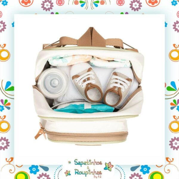 Possui dois bolsos internos, sendo um transparente. Perfeita para carregar todos os itens essenciais do seu pequeno
