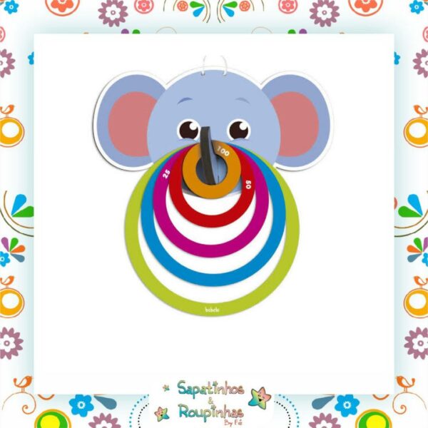 Contém 1 suporte com gancho para fixar na parede em formato de Elefantinho e 5 argolas para lançar.