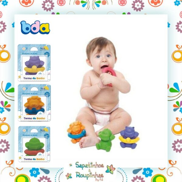Os amiguinhos da turma do banho vêm com boias coloridas para o bebê morder enquanto toma banho e chuveirinho para esguichar água!
