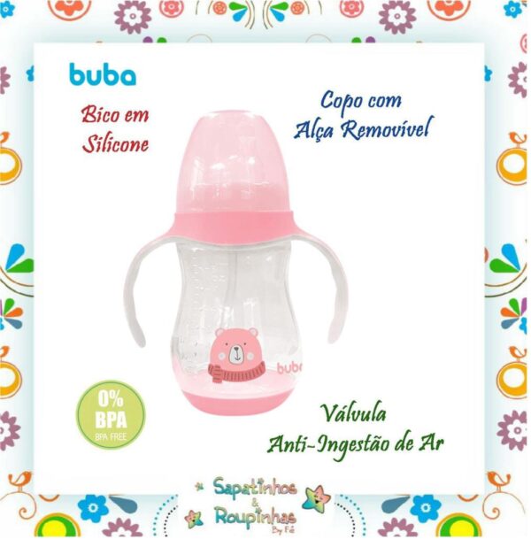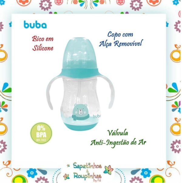 O copo com alça ursinho é perfeito para passeios e na fase de transição, com design anatômico, estampa de ursinho e lindas cores. Possui sistema interno que permite que o bebê beba em qualquer ângulo, devido a um pesinho na ponta do canudinho, bico em silicone livre de bpa, alças para maior segurança e conforto e tampa para vedação. A linha de alimentação da buba traz itens práticos que facilitam a vida das mães e acompanham as diversas fases da criança contribuindo para um crescimento saudável.