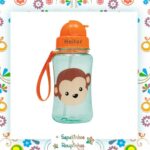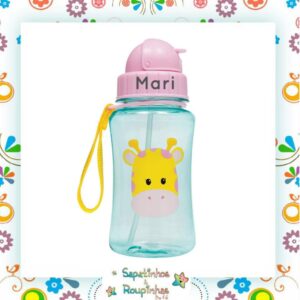 Possui proteção de uma tampa flip-top, com canudo em silicone e retrátil; vem com pulseira para ajudar a criança carregar sua garrafinha