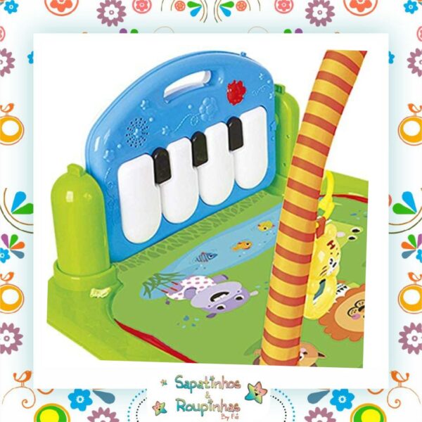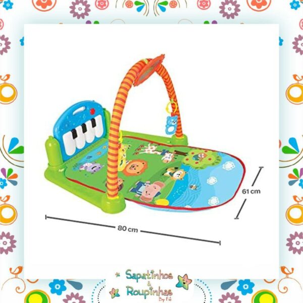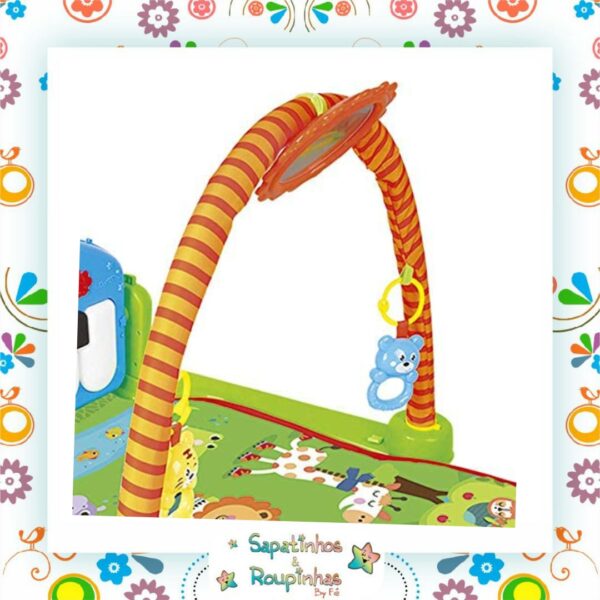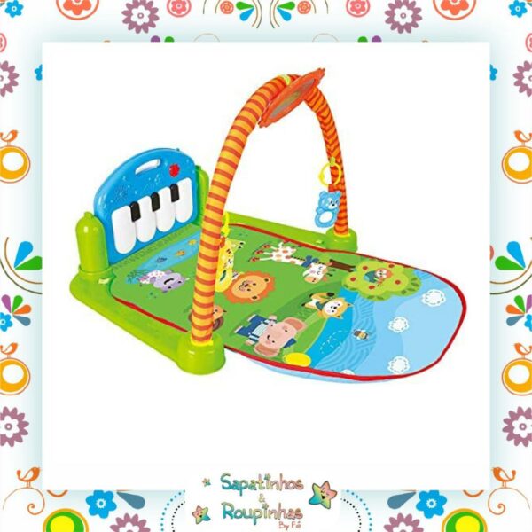 2 brincar deitado: tapete confortável e acolchoado. Arco com bichinhos de atividades pendurados para o bebê se divertir nesta fase em que só fica deitado. Espelho para o bebê se reconhecer. Piano com teclas grandes para o bebê tocar com os pés.