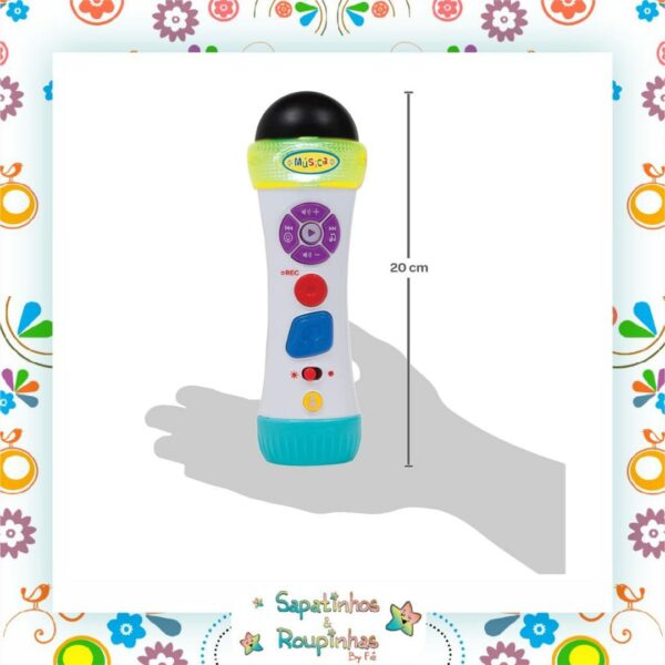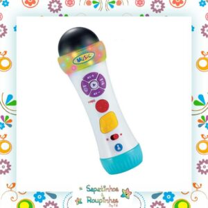 Os pequenos podem brincar de cantar, apresentar, entrevistar. E ainda tem mais, o microfone: grava e reproduz a voz, vem com músicas e efeitos sonoros, tem luzes multicoloridas e lanterna na parte inferior.