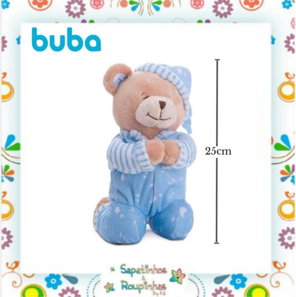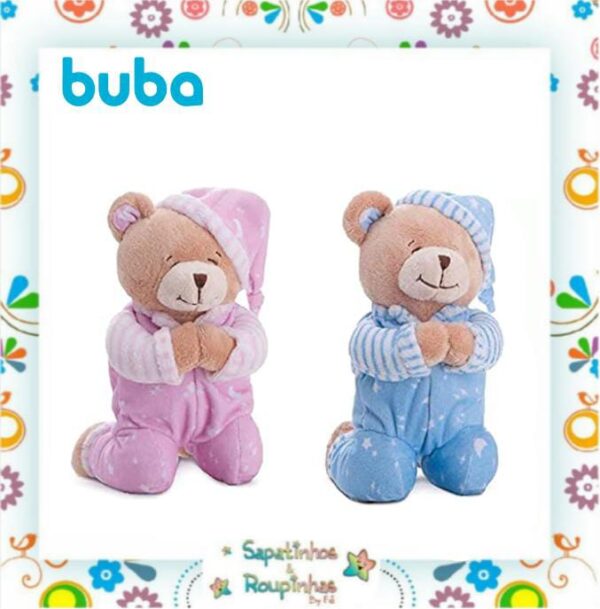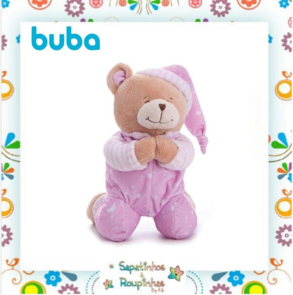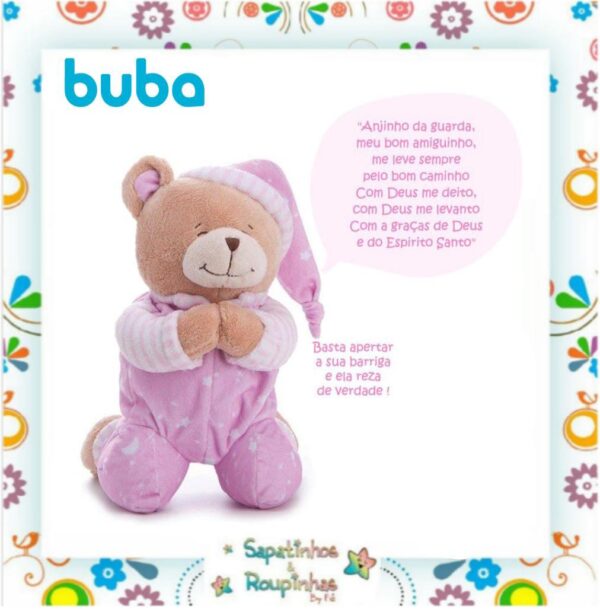 O Ursinho que reza da Buba é um lindo ursinho de pelúcia, que ao pressionar sua barriguinha ele reza: e; Anjinho da guarda, meu bom amiguinho, me leve sempre pelo bom caminho. Com Deus me deito, com Deus me levanto, com a graça de Deus e do Espírito Santo. Ele ensina e estimula a criança. Confeccionado em pelúcia antialérgica e atóxica. Possui certificação do INMETRO e é recomendado a partir de 3 meses. A Buba fabrica produtos de excelente qualidade, se preocupando sempre com o desenvolvimento do Bebê, através de estímulos sensoriais.