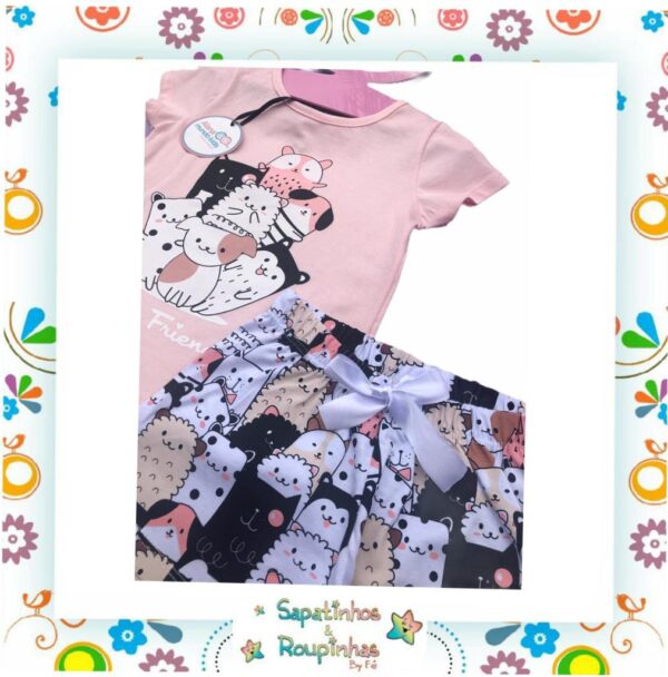 Composto por uma blusa de mangas curtas, com estampa frontal e shorts de tecido fresco.