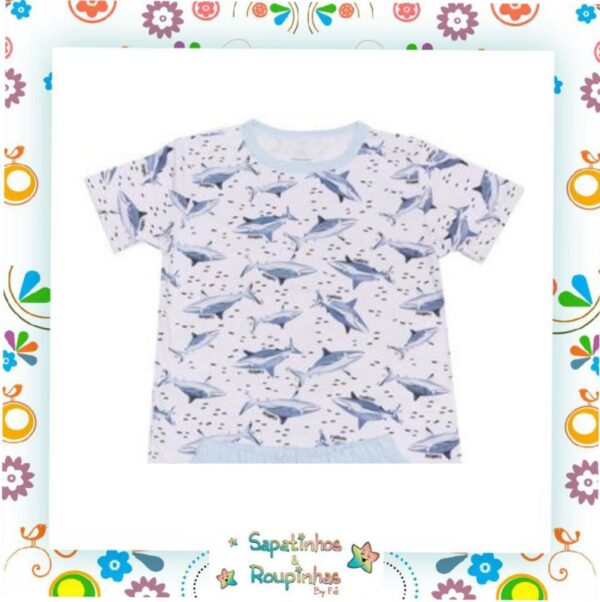 Composto por uma blusa de mangas curtas, com estampa frontal e shorts de tecido fresco.