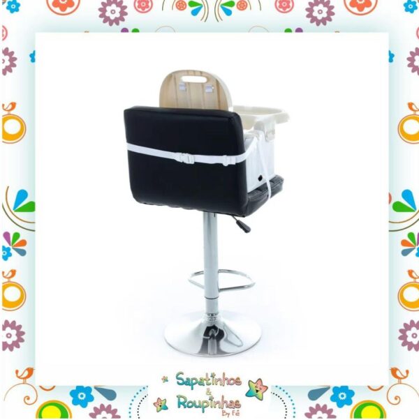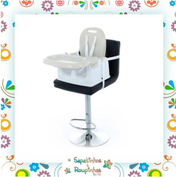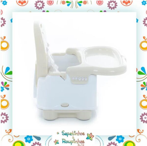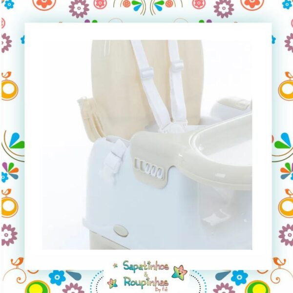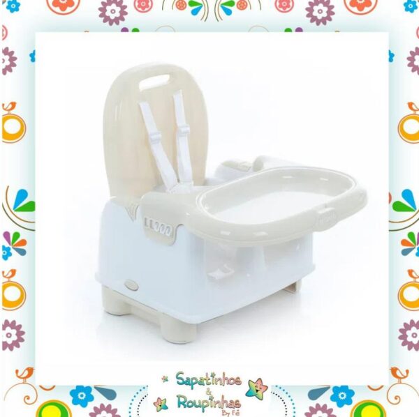 É fácil de transportar e instalar, permite que a criança participe das refeições com a família. Tiras para prender na cadeira de adulto e compartimento para guardá-las.