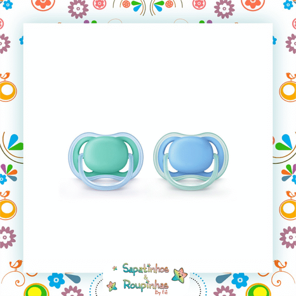 Chupetas Ultra Air Azul e Verde (Dupla) 6-18M Uma chupeta leve e com aberturas de ar para a pele sensível do bebê. Grandes aberturas para permitir que a pele do bebê respire.