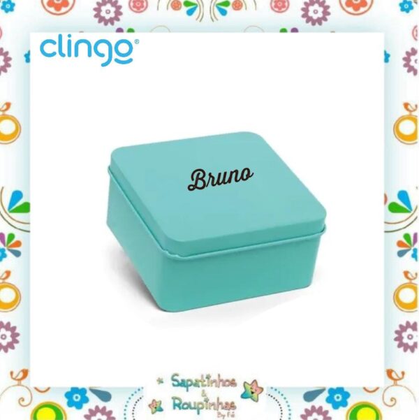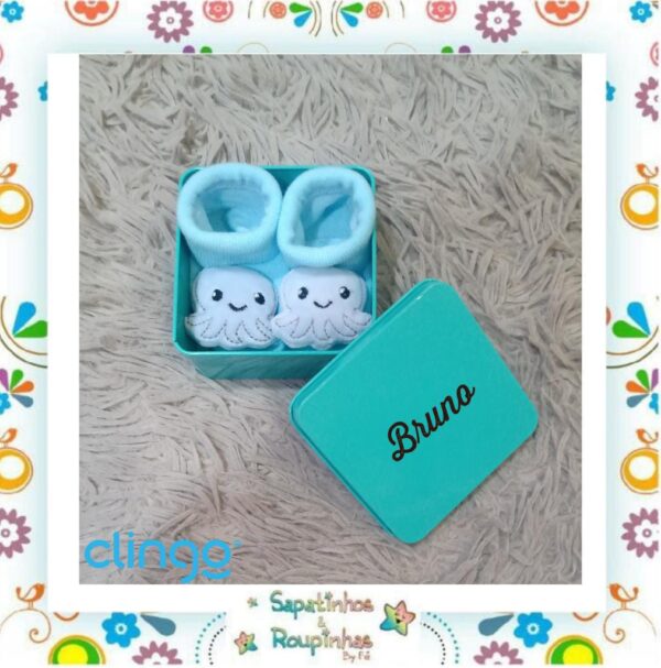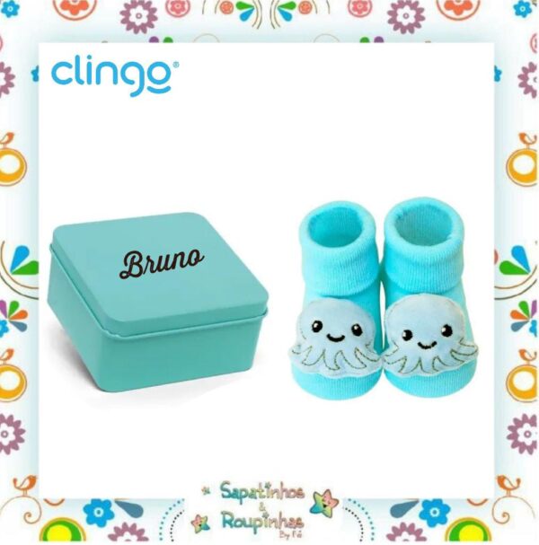 Clingo – Kit 1 par de pantufa antiderrapante com chocalho Tamanho Único + Latinha quadrada personalizada com gravação a laser