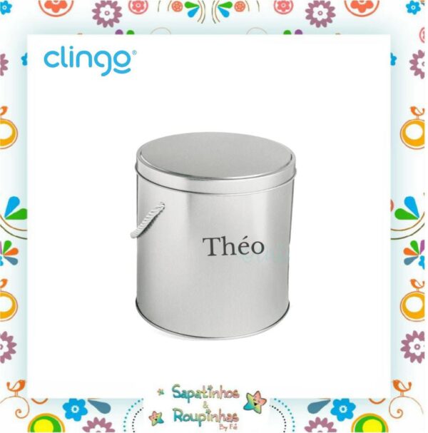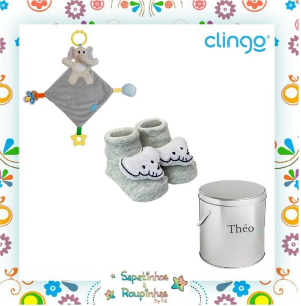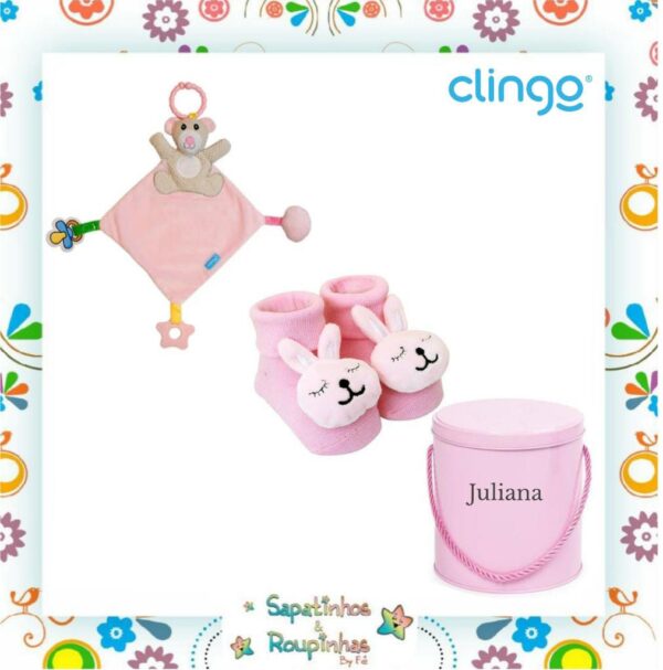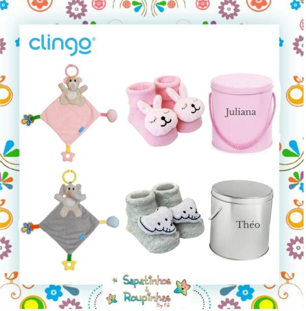 Clingo – Kit Pantufa antiderrapante com chocalho + Naninha com mordedor + Lata alta redonda com alça com gravação a laser