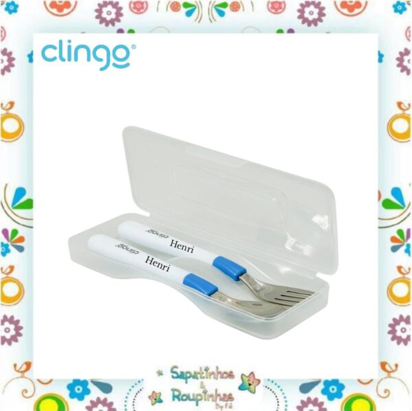 O Kit talheres com estojo Clingo é um conjunto de talheres que contém um garfo e uma colher confeccionados em aço inoxidável para bebês a partir de 18 meses de vida.