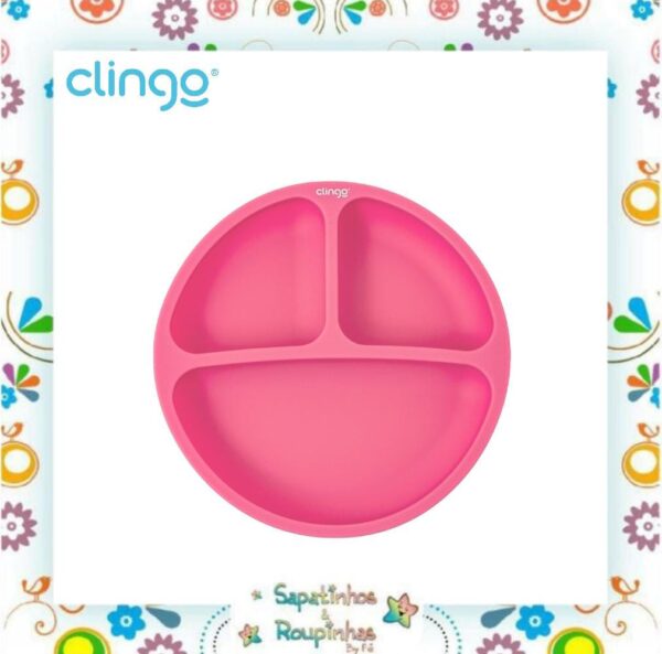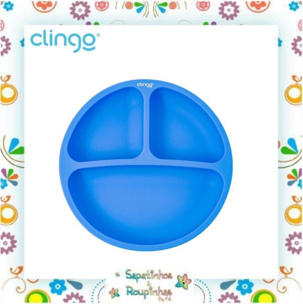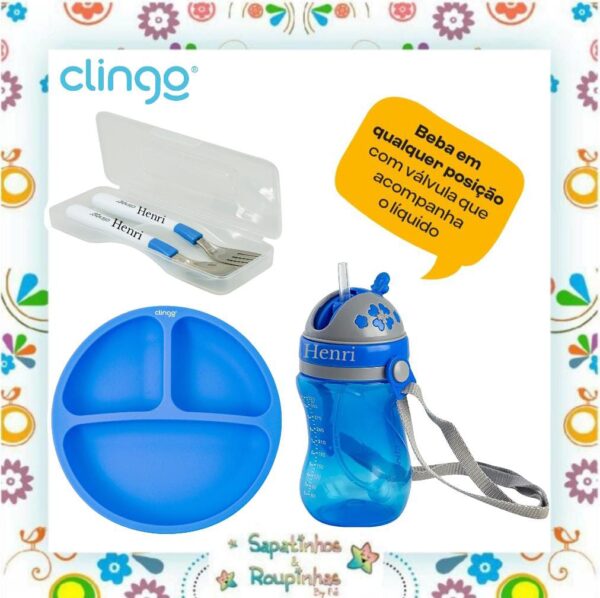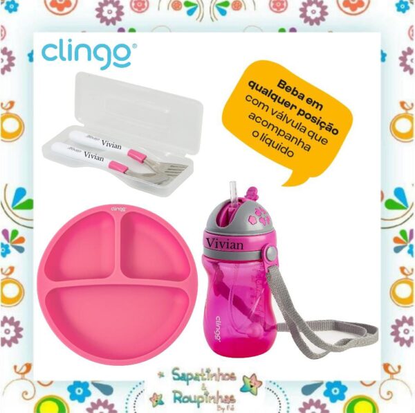 Clingo – Kit Prato infantil em silicone com divisórias + Talheres com estojo + Copo com canudo e válvula 320ml com gravação a laser
