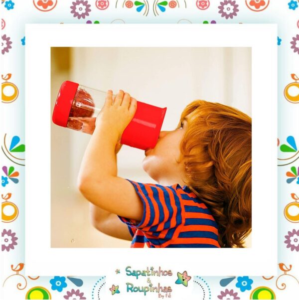 Você pode colocar frutas no compartimento na parte inferior do copo. Além disso, com sua tecnologia 360º as crianças podem beber de todos os lados, porque o copo não tem bico. O copo possui uma válvula que fecha automaticamente após beber, e também ajuda na transição para um copo aberto. A tecnologia Miracle conta com sistema anti vazamento que evita bagunças e é muito fácil de limpar. Um grande aliado para a saúde dental infantil, pois não possui nenhum tipo de bico.