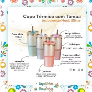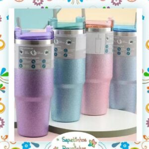 S&R – Copo Mug térmico 890ml com canudo, tampa e glitter brilhoso