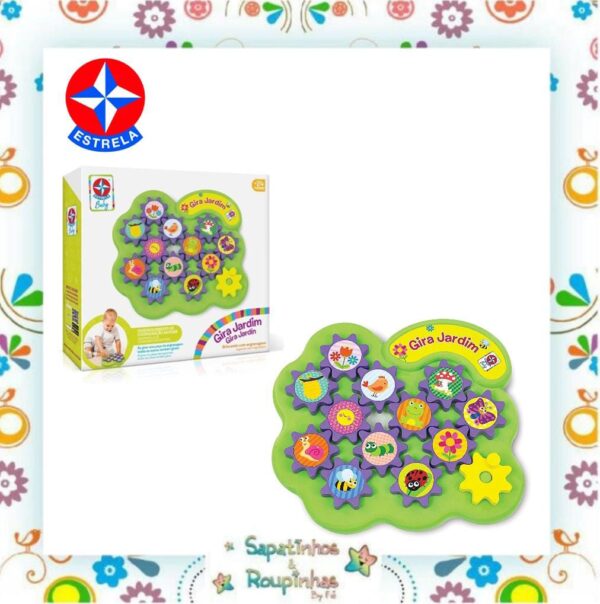 Gira Jardim é um playset com mecanismos de engrenagens e com desenhos fofinhos de animais e insetos de jardim que vão colorir esse divertido jardim. As engrenagens giram conforme a criança roda a alavanca fazendo todos os bichinhos se moverem no jardim.