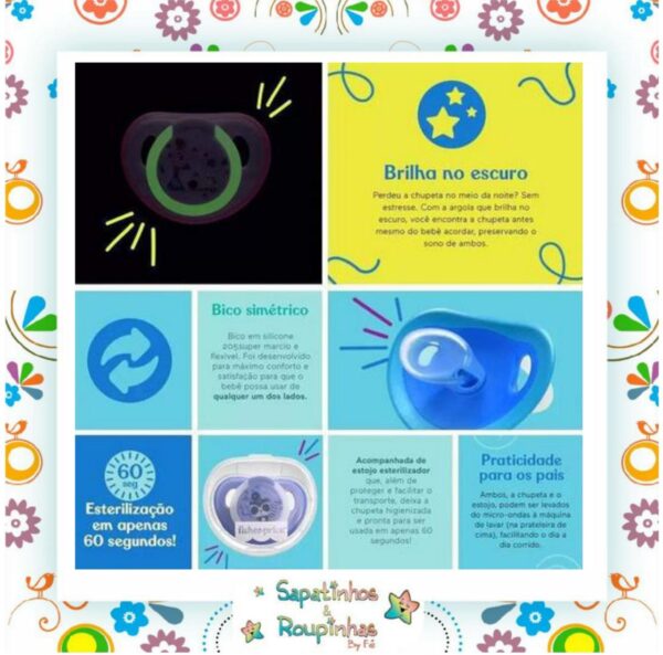Perdeu a chupeta no meio da noite? Sem estresse. Com a argola que brilha no escuro, você encontra a chupeta antes mesmo do bebê acordar, preservando o sono de ambos. Cuidado e conforto que seu bebê merece. Tranquilidade para o seu dia a dia. Tem bico em silicone super macio e flexível. Foi desenvolvido para máximo conforto e satisfação para que o bebê possa usar de qualquer um dos lados. Acompanha estojo esterilizados que, além de proteger e facilitar o transporte, deixa a chupeta higienizada e pronta para ser usada em apenas 60 segundos.