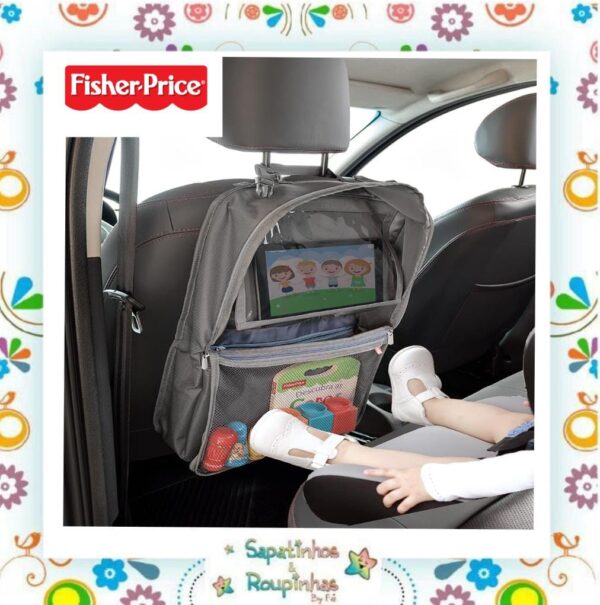 O organizador para carro com compartimento para tablet Fisher-Price bolsos práticos com etiquetas indicativas informam onde guardar os brinquedos, lenços, chupetas, mamadeiras e fraldas. Tem dois fechos de segurança para fechamento do organizador e compartimento com zíper para guardar tablet até 9,7 polegadas. Também com alças vira maleta para carregar o organizador e ganchos para fixar no assento do carro.