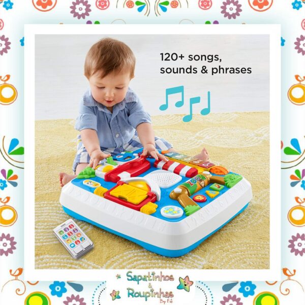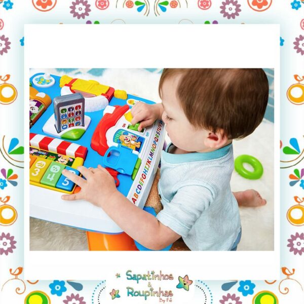 Muitas atividades para manter o bebê ocupado, incluindo o faz de conta de brincar de telefone, girar os rolinhos, apertar botões, abrir portas, etc.