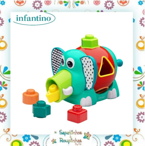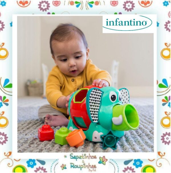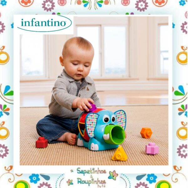 Nova torção para o clássico classificador de forma. Este elefante amigável permite que as crianças pressionem suas orelhas para liberar as formas e classificar. É uma exploração divertida através da visão, toque e som.