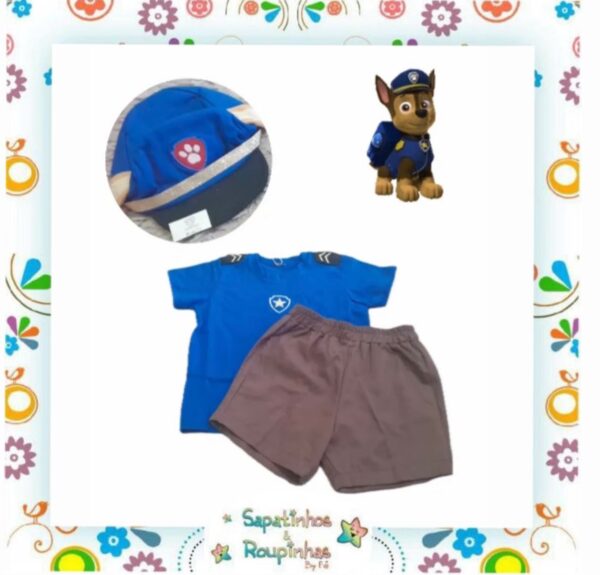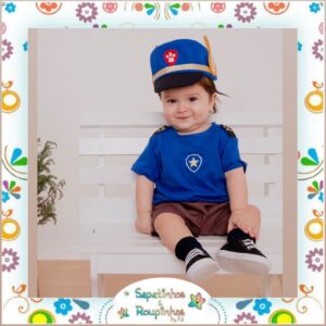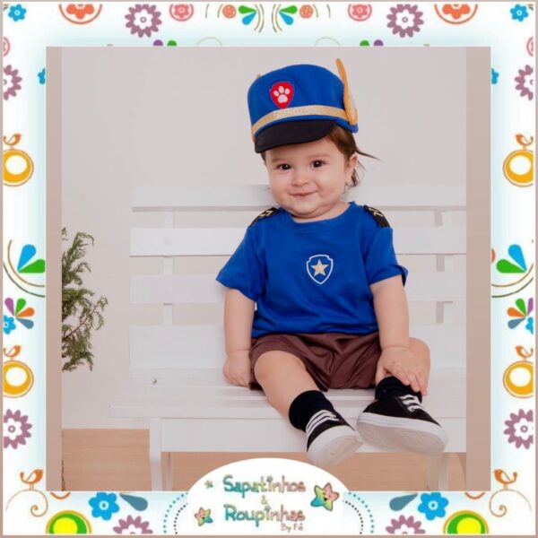 ✔️ Design fiel ao personagem – Inclui camisa azul com detalhes do uniforme policial, colete, calça e a clássica boina com o distintivo da Patrulha Canina