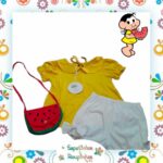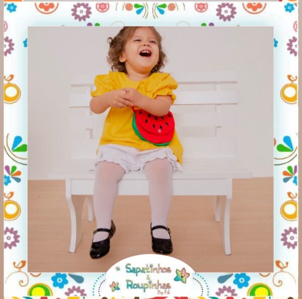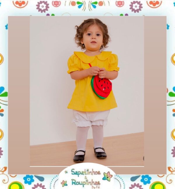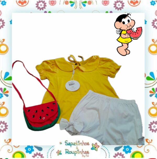 Fantasia composta por batinha amarela, short de algodão e bolsa de melancia.
