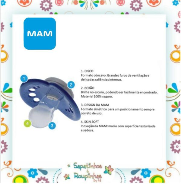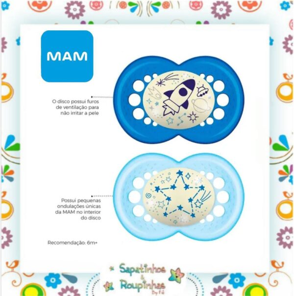 A Chupeta Original Night da MAM possui um botão que brilha no escuro é fácil de encontrar e tem o material 100% seguro, seu disco é curvado para máximo conforto, delicado com a pele: permite a circulação do ar pelo design exclusivo da MAM. SkinSoft silicone, com superfície de silicone SkinSoft, possui textura macia e sedosa aceita por 94% das crianças.