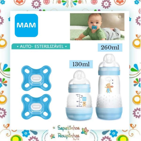 MAM – Kit 2 Mamadeiras Easy Start Anticólica 0+M + 2 Chupetas Comfort 0-2M Azul