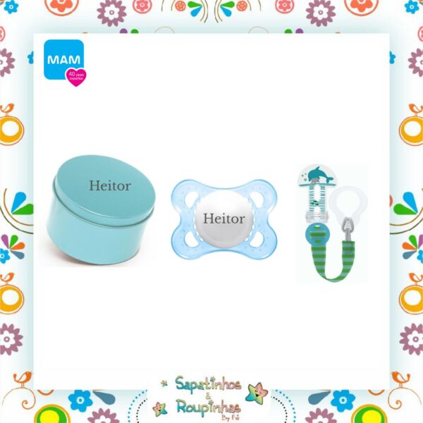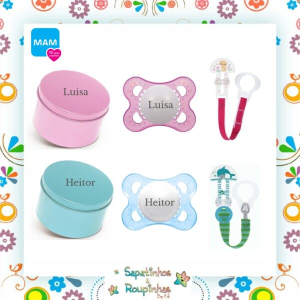 MAM – Kit 3 Peças Prendedor + Chupeta + Embalagem De Metal Com Gravação A Laser