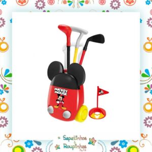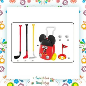 O Kit acompanha uma linda maleta de golfe do Mickey com 3 tipos diferentes de tacos, 2 bolinhas de golfe e uma bandeira de pontuação. Treine, brinque e jogue, adicionando seus próprios obstáculos e rotas para se tornar um especialista no golfe!