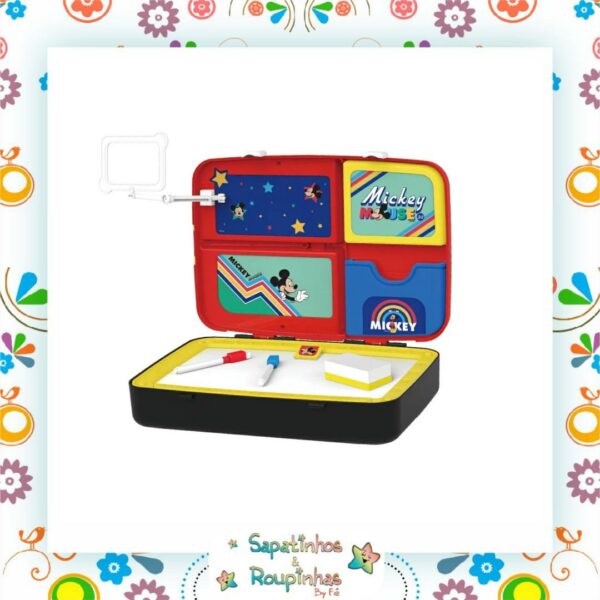 Ao abrir a mochila, descubra diversos acessórios inclusos, como letras e símbolos em ímãs, canetas, giz e apagador, cards do Mickey e muito mais.