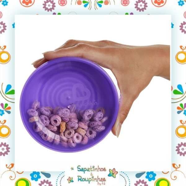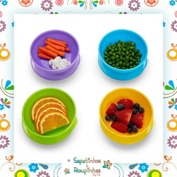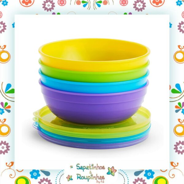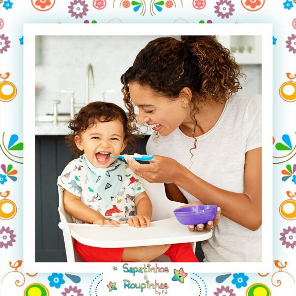 As tigelas são anti vazamentos e podem ser utilizadas no micro-ondas, sem a tampa. Cuidado: Lave e inspecione. Pode ser usado na parte superior da lava-louças. Remova a tampa antes de colocar a tigela no micro-ondas. Descarte e substitua ao primeiro sinal de desgaste ou dano. Sempre verifique a temperatura antes de dar para a criança. Não deixe a criança andar ou correr quando estiver com as tigelas e colheres. Não deixe a criança sozinha. Descarte todos os componentes da embalagem antes de dar as tigelas e colheres para a criança.