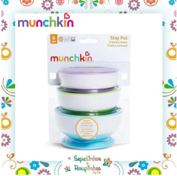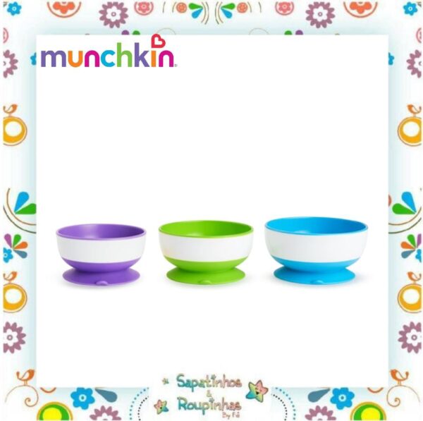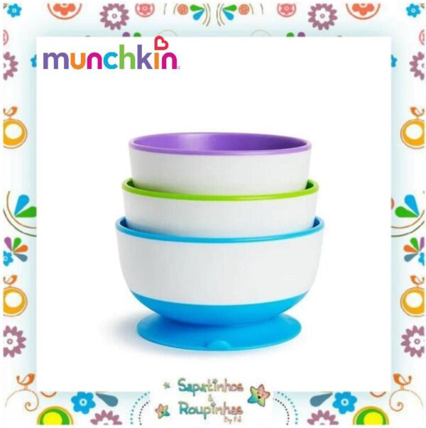 O Kit de Tigelas da Munchkin é ideal para evitar sujeira, pois a ventosa adere a superfície evitando que a criança vire a tigela.