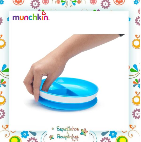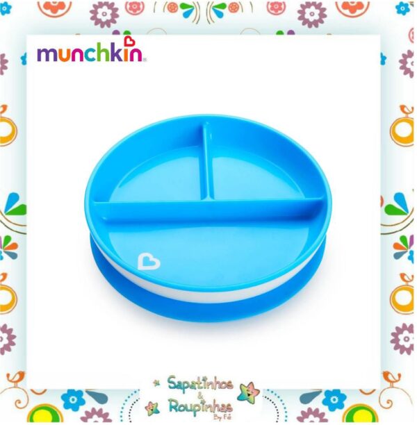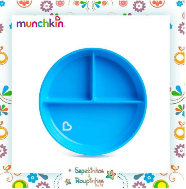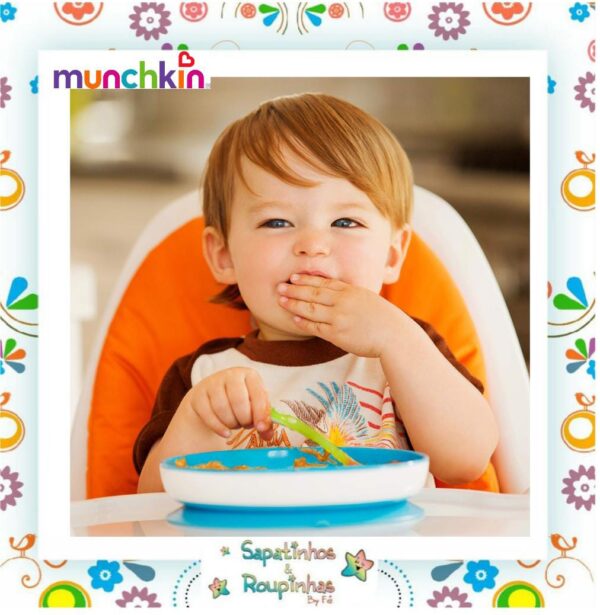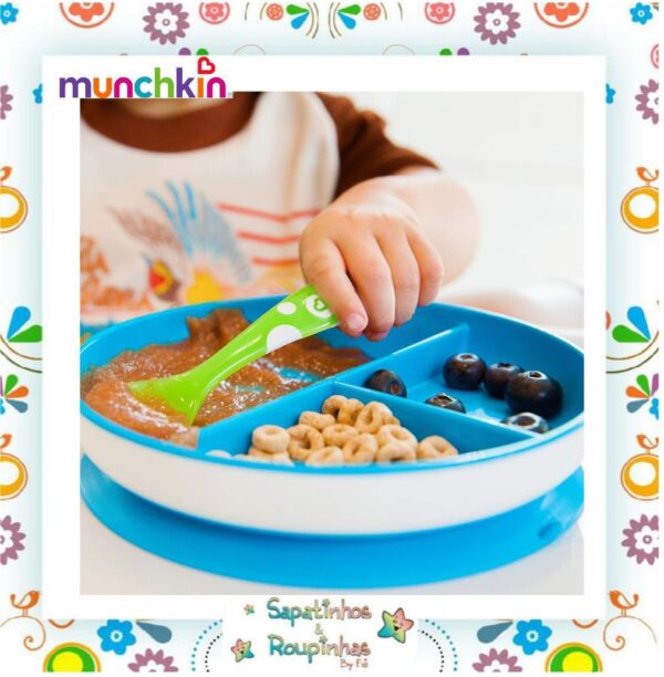 O prato de treinamento com ventosa e divisórias da Munchkin facilita a auto alimentação do bebê com suas repartições e bordas elevadas, que ajudam a pegar a comida facilmente com a colher, e impedem que o alimento caia para fora, favorecendo o aprendizado do bebê.