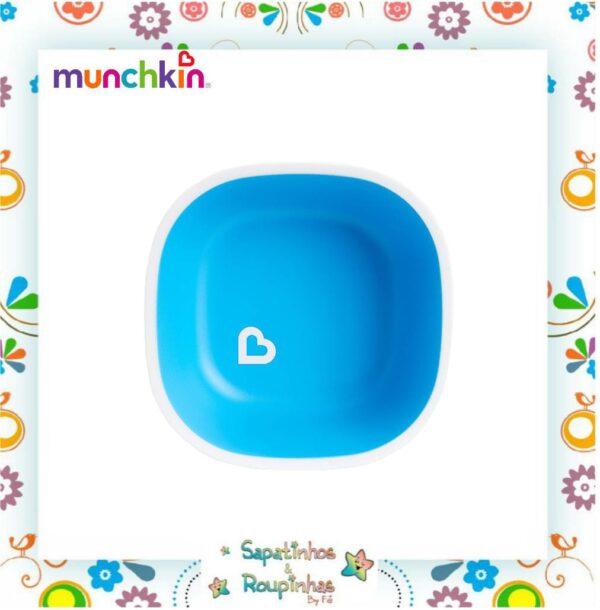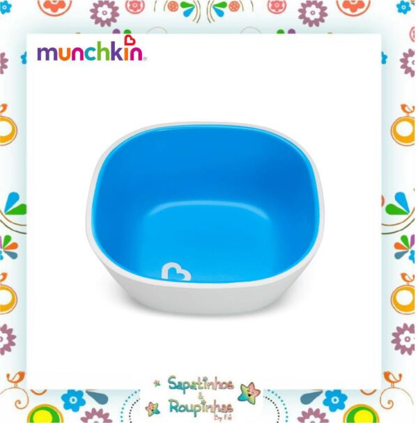 Tijela Bowls Munchkin, com design moderno e brilhante, colorido por dentro e detalhes em branco na parte externa, possui laterais altas facilitando a alimentação.