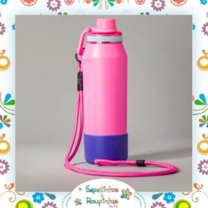 A alça flexível presente da tampa da garrafa, facilita o transporte e permite que a garrafa se movimente de maneira confortável, prática e segura.