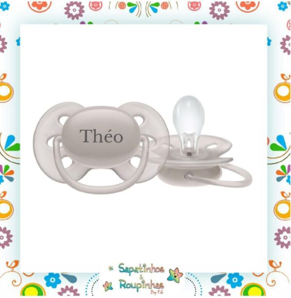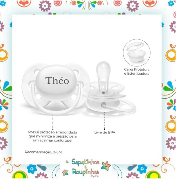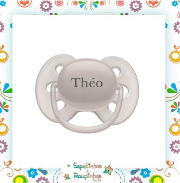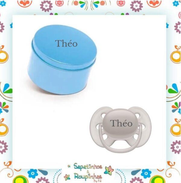 A chupeta vai personalizada com o nome do seu bebê e ainda acompanha uma linda embalagem em metal também personalizada.