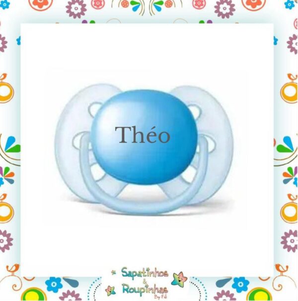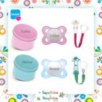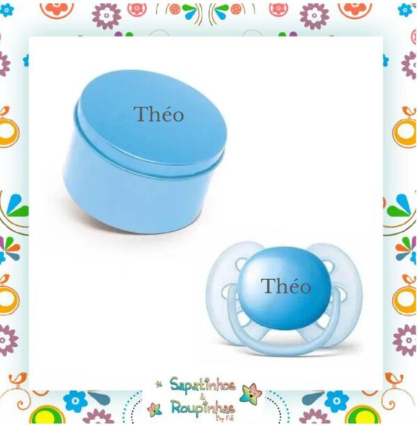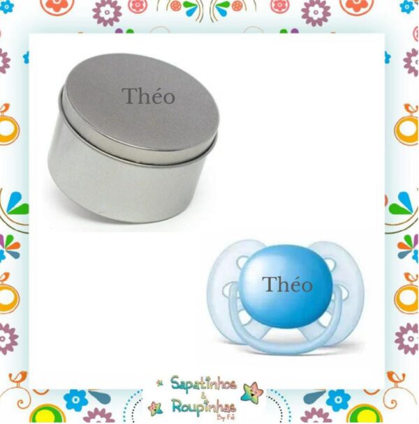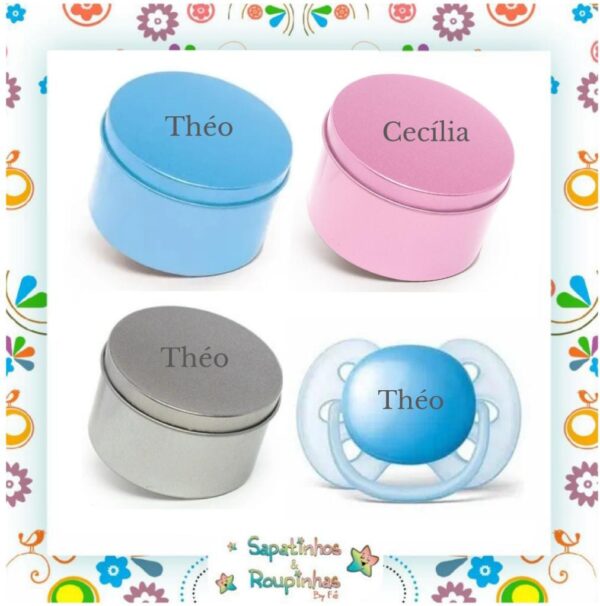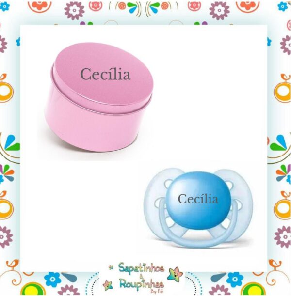 A chupeta vai personalizada com o nome do seu bebê e ainda acompanha uma linda embalagem em metal também personalizada.