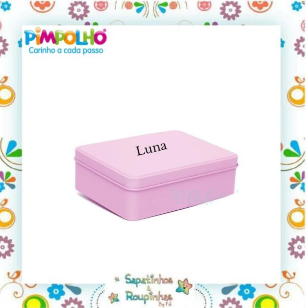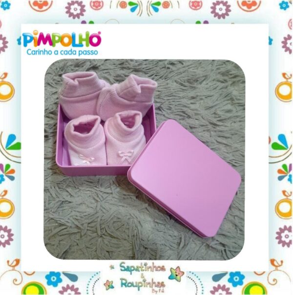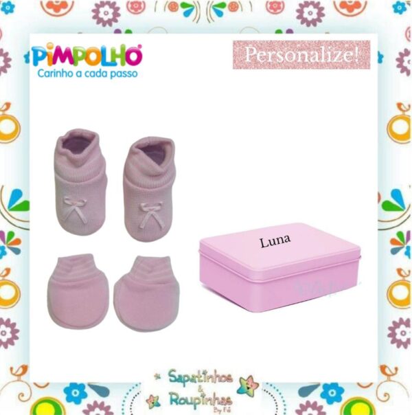 Pimpolho – Kit Par de luvas e Par de sapatinhos + Latinha Retangular Rosa com gravação a laser