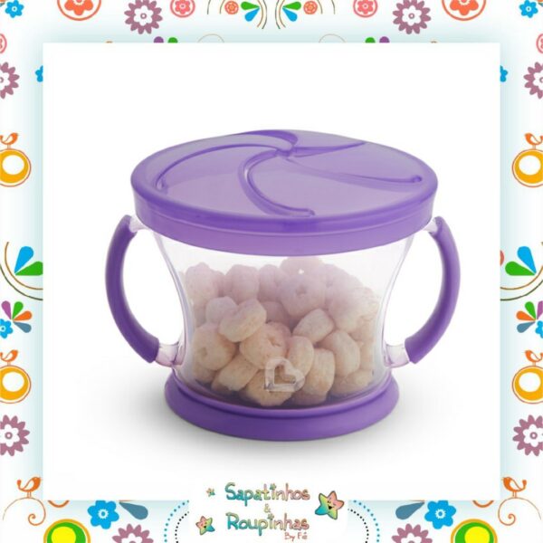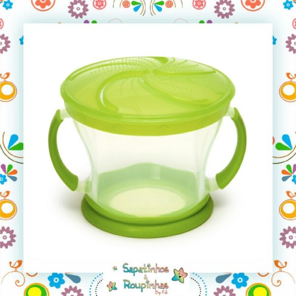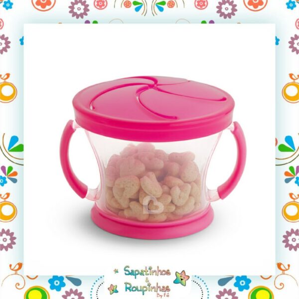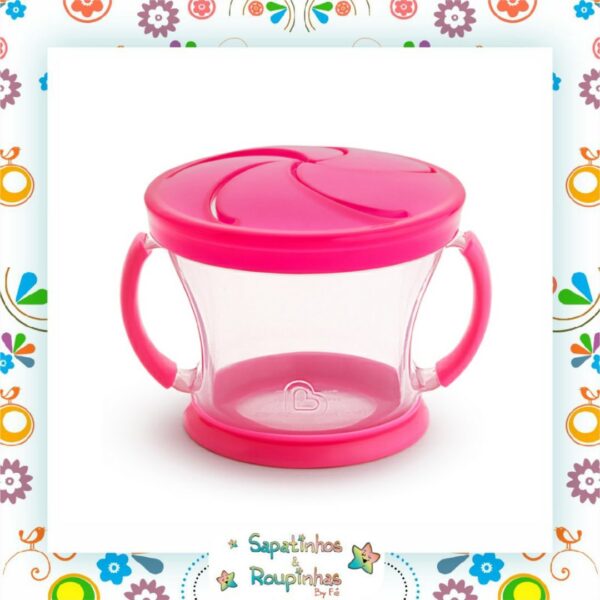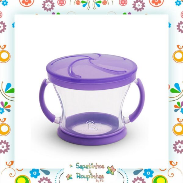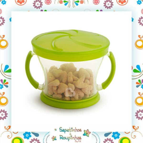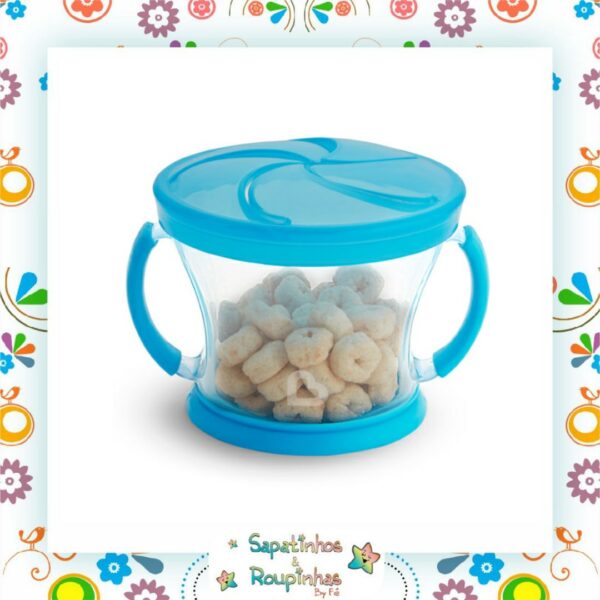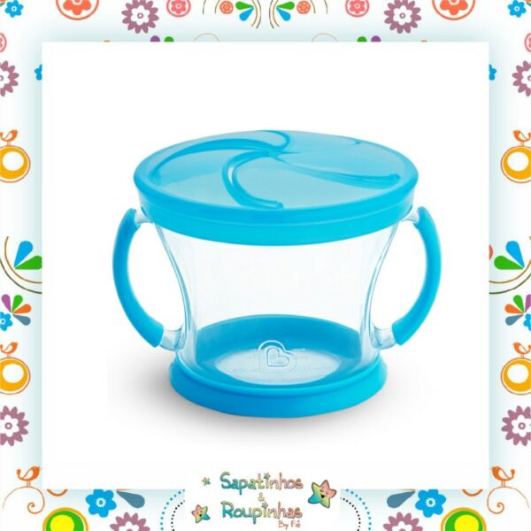 O Porta Biscoito Munchkin possui alças emborrachadas e abas macias o suficiente para que a criança pegue o alimento sem dificuldades com segurança e sem risco de derramar.