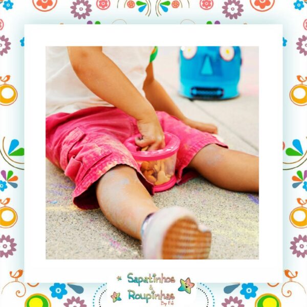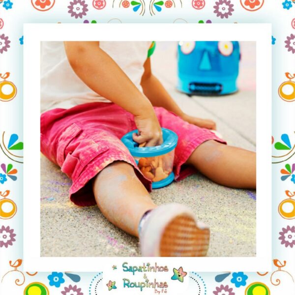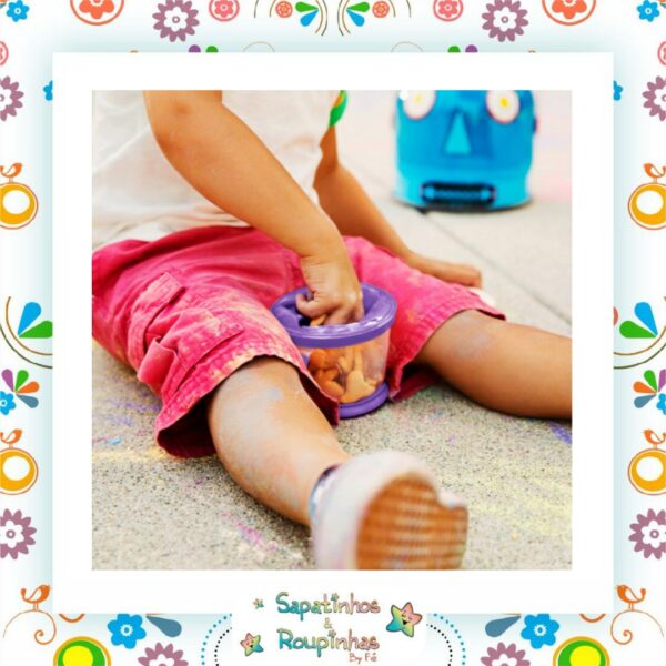 A parte debaixo é emborrachada, para que o pote não escorregue na mesa. Na parte de baixo há um espaço para colocar o nome da criança, perfeito para escola, passeios e viagens.
