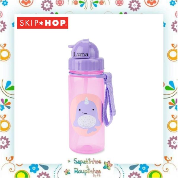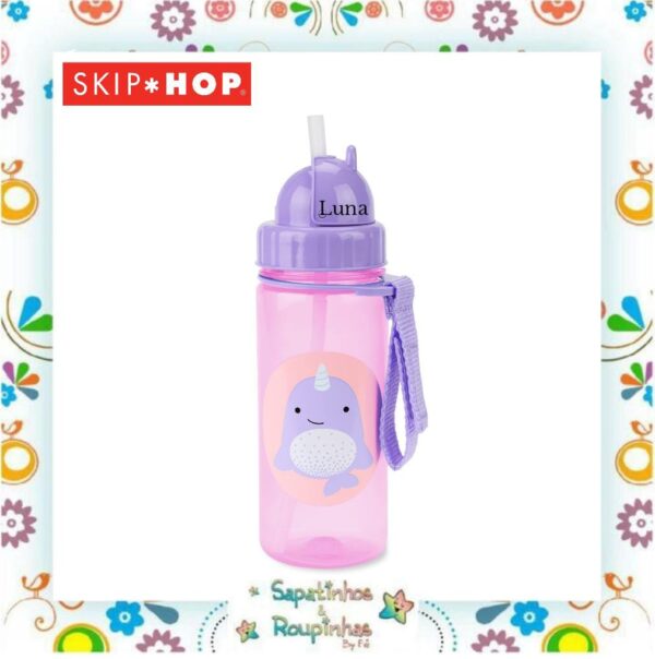 A garrafa flip zoo baleia narval da skip hop é perfeita para acompanhar os pequenos para qualquer lugar. Feita em material extremamente resistente, não mancha nem pega odor e sabor. Com a proteção de uma tampa flip-top que mantém o canudo sempre limpo, tem vedação de silicone para evitar vazamentos. Acompanha alça que se conecta a qualquer lugar.