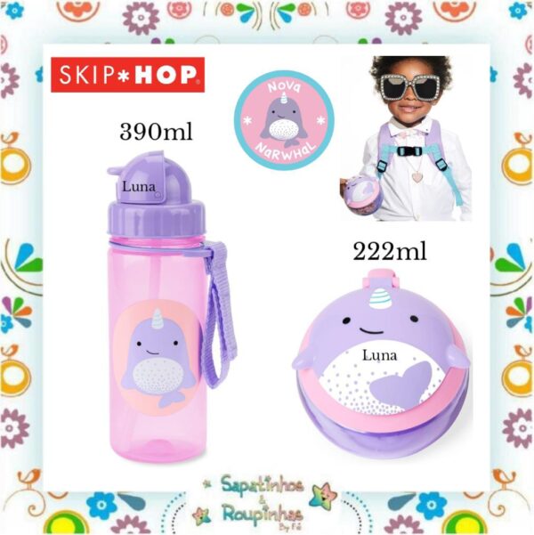Skip Hop – Kit Porta Snack Zoo Baleia 222ml + Garrafa Flip Zoo Baleia Narval 390ml com gravação a laser
