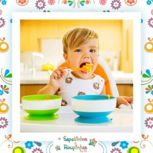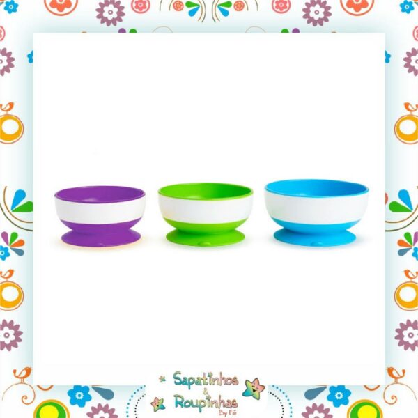 Possuem 3 tamanhos convenientes, com ventosas. Acima de 6 meses, não contém BPA. Fácil de usar: suas ventosas as mantém fixos, prevenindo derramamentos. Para usar: coloque as tigelas em uma superfície lisa, limpa e plana. Para retirá-las, puxe a aba de liberação localizada na ventosa. Para limpar: lavável em lava-louças.