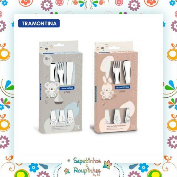 Jogo de Talheres Infantil Tramontina em Aço Inox acabamento Brilho com Desenho em Alto Relevo 3 Peças, da linha Le Petit, a hora da refeição será pura diversão.
