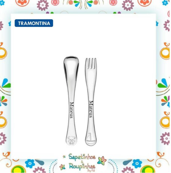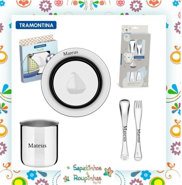 Tramontina – Kit talheres + prato + copo aço inox infantil Le Petit com gravação a laser