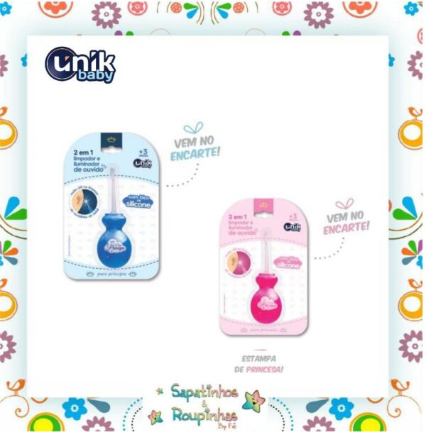 O limpador de Ouvido 2 em 1 com Iluminador de Ouvido em Silicone com Luz de Led Unik Baby, projetado especialmente para encaixar perfeitamente no ouvido do bebê, ajudando a ver claramente como está o ouvido do bebê para remoção do excesso de cera do ouvido com segurança, este produto deve ser utilizado com cautela, qualquer dúvida procure ajuda profissional.
