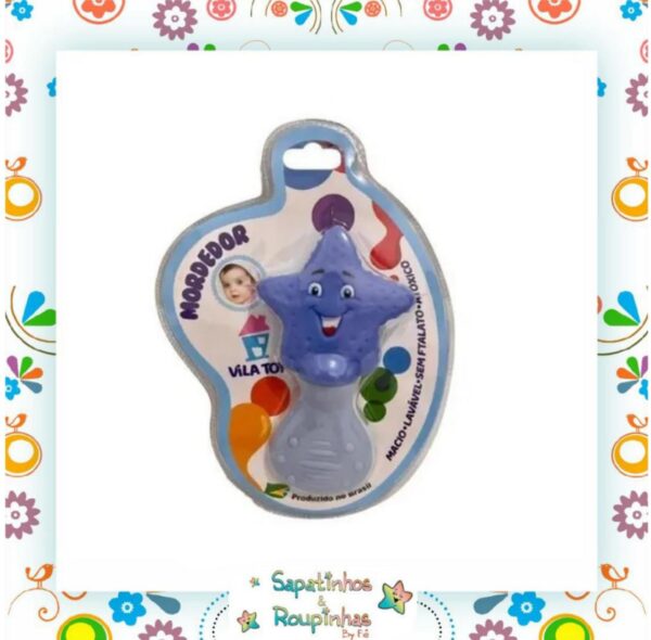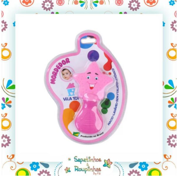 Mordedor em formato de estrelinha, marca Vila Toy, material macio, lavável, sem ftalato (composto que ajuda na emoliência do plástico), atóxico. Recomenda-se a esterilização com sabão neutro e água corrente antes do primeiro uso. Brinquedo recomendado para crianças maiores de 2 meses de idade.