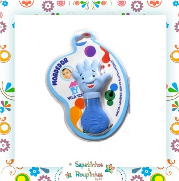 Mordedor em formato de mão, marca Vila Toy, material macio, lavável, sem ftalato (composto que ajuda na emoliência do plástico), atóxico. Recomenda-se a esterilização com sabão neutro e água corrente antes do primeiro uso. Brinquedo recomendado para crianças maiores de 2 meses de idade.
